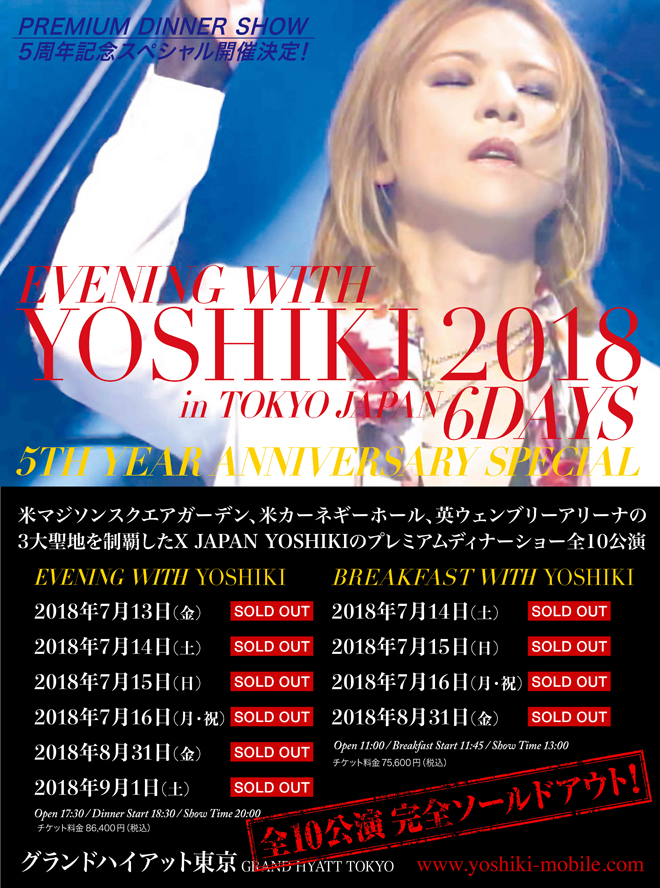 今夏開催されるYOSHIKIのディナーショー<EVENING WITH YOSHIKI 2018 IN TOKYO JAPAN 6DAYS 5TH YEAR ANNIVERSARY SPECIAL>の全10公演のチケットがソールドアウトした。