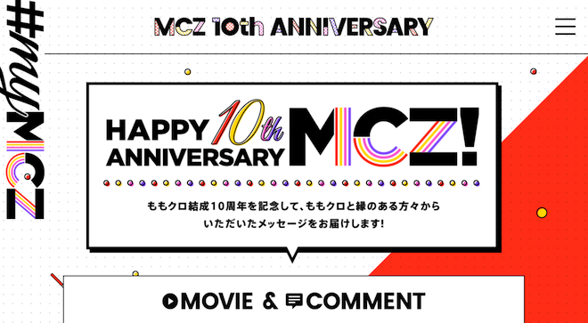 ももいろクローバーZの結成10周年企画特設サイト『MCZ 10th ANNIVERSARY』内に、ももクロをみんなで祝う「#mymcz」ページと、ももクロの歩んできた10年の歴史がわかる「HISTORY」ページが新たに開設された。