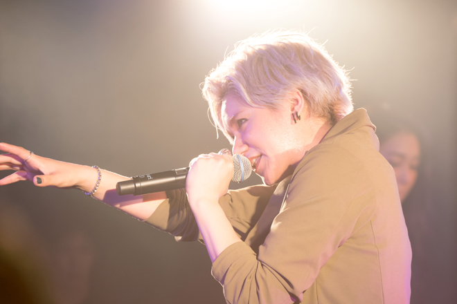 ピアノ、ギター、ベース、ドラムの4人編成のバンドを従え、まずはArinが一人でステージに登場し、一曲目の「Season」を歌い始める。続いてRisa、Saoriとソロパートを歌い継ぎ、サビで3人の声が重なると花が咲きほころぶように、会場に笑顔が広がった。何より緊張をものともせず、楽しそうな表情で歌い上げる3人のパフォーマンスがとても良い。続く「イマココ」は、歌い終わった後に作詞作曲者であるRisaが「この曲はトンネルから見える光からインスピレーションを受けた」と説明して2人を驚かせていたが、3人の力強いハーモニーは明るく照らす光をちゃんと放っていた。