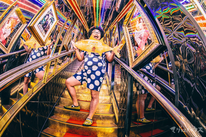 “アフロマンス feat.松村宗亮”の後のタイムテーブルは、佐武宇綺、KenKenが登場するなど、DJ陣も豪華であった。そして遂に19時より行われたマグロ解体ショーでは、新宿 RUIDO K4に出演していた軟式globe。’12のパークマンサーがサプライズで登場し、(もちろんあの曲をかけながら)ショーの開始を告げた。まな板のサイドでは板前スタイルのコスチュームに身を包んだ美女がダンスし、フロアも大盛り上がりのなか、浅草橋の老舗寿司店「たいこ茶屋」の若大将が巨大マグロを包丁一本で鮮やかにさばいていく。まずは御カシラからスタートし、解体されていくたびに「よいしょ!」という掛け声がフロアがあり、若大将が部位をひとつ掲げるたびにドッと歓声がわく。掲げられたマグロの身を室内のまばゆい電飾が一層輝かすという、カオティックかつ異様な光景が広がり、画像や動画を抑えようとスマホを手放さなかったオーディエンスが多かったのも無理ない。インスタ映えの極みのようだった。パフォーマンス後には約200名分のお刺身が振舞われた。