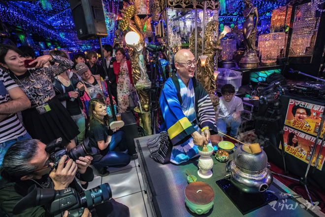 だが、“マグロ解体ショー”の前に、同会場で15時より行われた“アフロマンス feat.松村宗亮”というコンテンツも全くの新感覚だった。何を隠そう、松村宗亮氏とは茶道家で、アフロマンスがDJする空間で茶道のデモンストレーションを楽しむことができるのだ。ブラー「Song 2」が響き渡るなか颯爽と登場した松村氏は、愛本店のホストにお茶を淹れてゆく。上半身はビートに乗りながらも、あくまでも手元は美しく、釜から柄杓で湯を汲む所作まで思わず見とれてしまったほど。