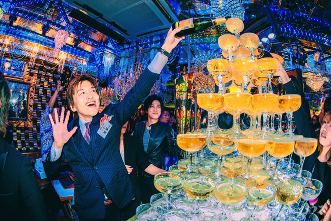 これが本日のピークタイムと思いきや、その直後、ホストクラブならではのシャンパンタワー(通常価格100万円以上だという)がこの興奮状態に対してダメ押しのように出現した。シャンパングラスを組むとき特有の緊張感にライブ感を覚えつつ、いざシャンパンが注がれる際のBGMと言えばもちろん、「注いじゃって〜」といったシャンパンコールだ。間近で体験すると、軽いめまいを覚えるほどリッチな雰囲気を味わう。