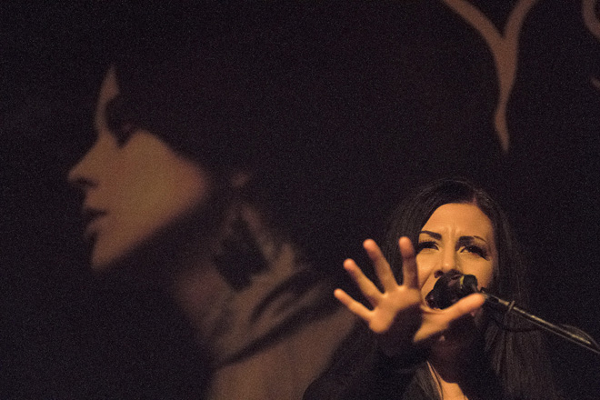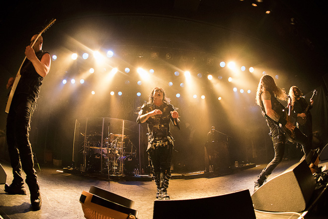 それにしてもやたらとぐるぐる回っているギターが目を引く。数回転ではない。10回も20回も、それも相当のスピードでぐるぐると回ってみせているのだが、ほんのちょっともふらつく様子を見せないのだ。彼の三半規管はどうなっているのだろう。その後も1996年のセカンド・アルバムのタイトル曲「Dusk and Her Embrace」、ジル・ド・レに捧げる「The Death of Love」、昨年リリースのニュー・アルバム『クリプトリアナ~腐蝕への誘惑』から「You Will Know the Lion by His Claw」と披露されたところで前半終了。すでに1時間が経過しているが、演奏された楽曲は8曲のみ。単純に平均すれば、1曲7分強ということになる。しかしクレイドル・オブ・フィルスのような、映画的要素、物語的要素が強いバンドの場合、必然的に曲は長くなる傾向にあるのだろう。ストーリーを伝える歌詞的にも、雰囲気を作り上げる音楽的にも、ある程度の長さがないと、その世界観に没入できないからである。それにしてもダニのヴォーカリスト、そしてストーリー・テラーとしての力量の高さには驚かされる。彼は一体何通りの発声ができるのだろう?