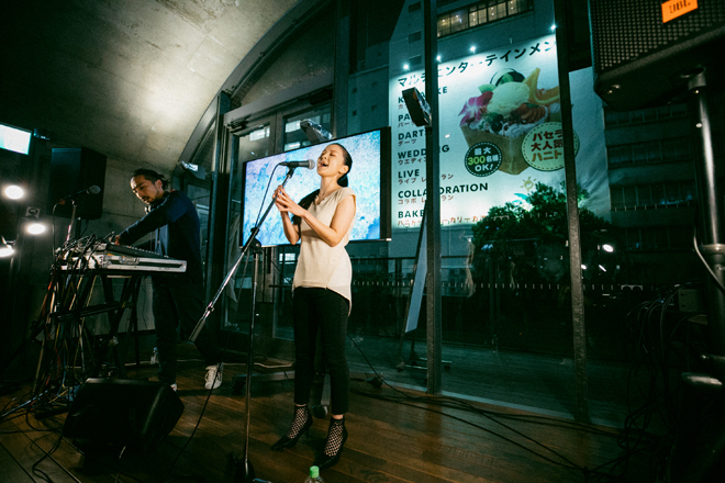 19時15分、定刻通りに始まった<HAIOKA PREMIUM LIVE>。オープニングは2013年にリリースしたEP「Harumi」のタイトルナンバー「Harumi」だ。早めの4つ打ちに緩やかに揺蕩う琴の音が印象的な作品で、会社帰りだと思われるサラリーマンをはじめ、集まった人たちが早速身体を揺らす……。HAIOKAのアンビエンスが、1912年に完成した赤煉瓦造りの万世橋高架橋で自然と作り出され、加えて「カワサキ」がプロデュースする“五感を楽しむ”空間というコンセプトが、1曲目から程よくマッチしている。