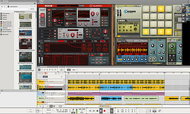 ▲Reason Liteの画面。最新版「Reason 10」と同じ楽器やエフェクトが利用可能。レコーディング・ツール、ミキシング・ツールも備えるが、トラック数などの制限がある。