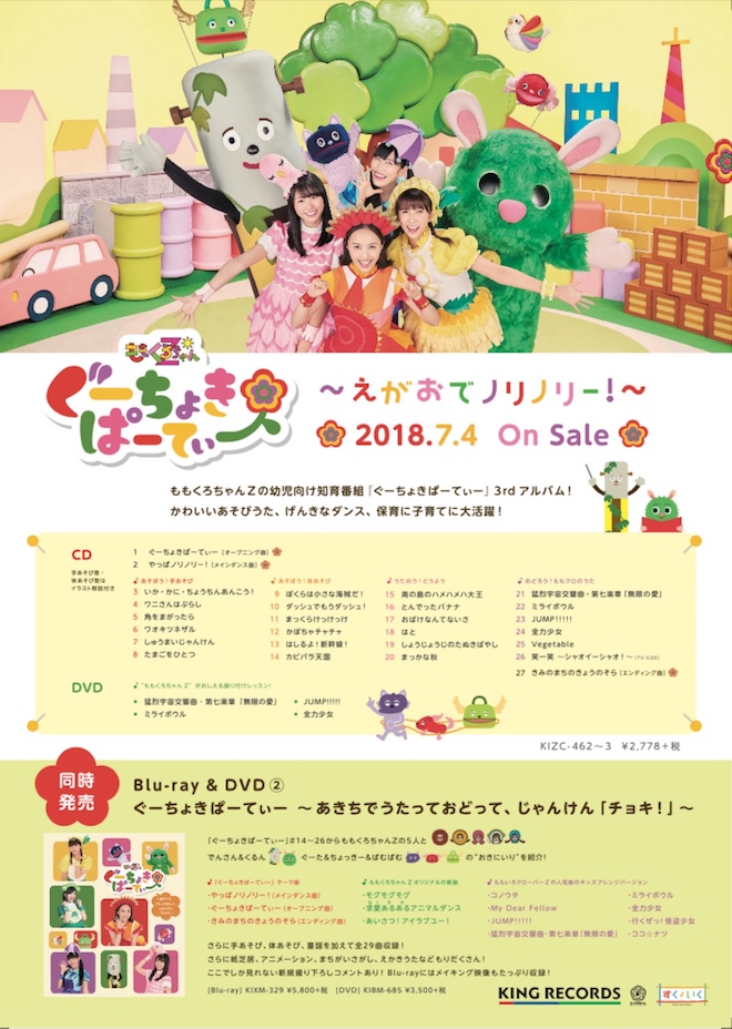現在Huluにて配信中のももくろちゃんZの幼児向け知育番組『ぐーちょきぱーてぃー』。そのCD&DVD第3弾『ぐーちょきぱーてぃー 〜えがおでノリノリー!〜』は、あそびうたや童謡、ももいろクローバーZの楽曲のキッズver.など全27曲収録CDと、振り付けレッスンが4曲分入ったDVDをセットにしたもの。