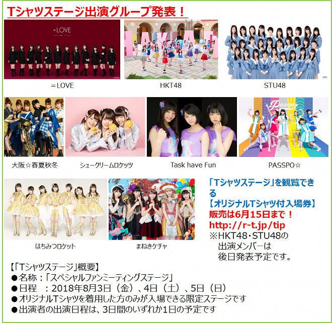 また、「Tシャツステージ」にはHKT48、STU48、=LOVE、大阪☆春夏秋冬、シュークリームロケッツ、Task have Fun、PASSPO☆、はちみつロケット、まねきケチャの出演が決定。当日は、出演アイドルが会場入り口でファンを出迎える“スペシャルファンミーティングステージ”や、スマートフォン限定の写真撮影OKタイムといった企画も実施されるという。