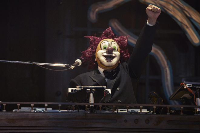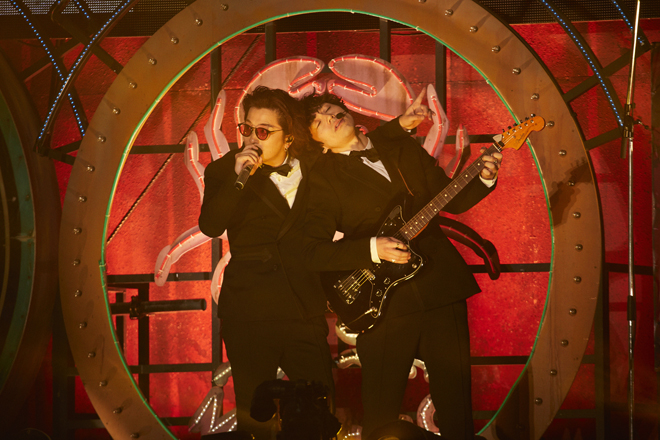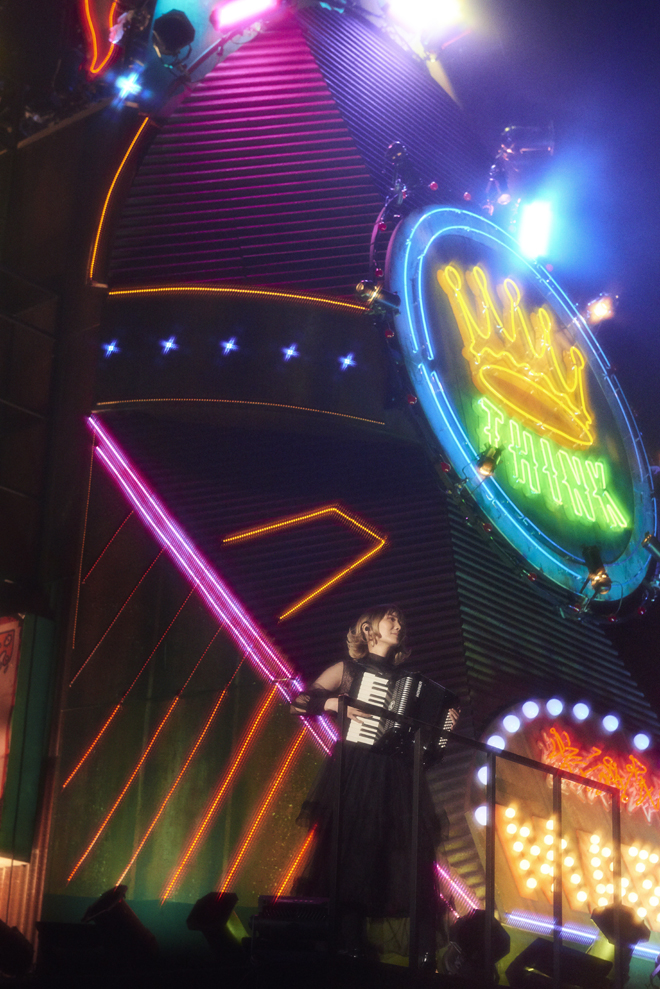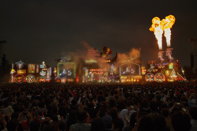 だが17時50分、ステージ上の巨大な列車のセットから鳴った怒号のような汽笛の轟音を合図に始まったのは、もちろん生易しいショーなどではなかった。それこそがこのバンドの誠実さであることは言うまでもない。はじめは爛々とした多国籍風のステージセットが視界いっぱい広がるそのスケール感に圧倒され、感激したが、そのあと直感的に感じたのが違和感であった。不気味とも形容できる。オランウータンやクジラが登場した昨年2017年のドーム・スタジアムツアー<Tarkus>の空間とはまったく違うメッセージが肌に伝わってくる。会場が同じ<炎と森のカーニバル>とも違う。ここは、森の奥に密かに広がる世界ではなく、今現在私達が身を置いている現実世界。俗世界なのだと思った。出現させたのは、興奮と虚無を内包する歓楽街である。ライブがスタートすれば、多くのダンサーが登場したことから、“人”の存在そのものも強烈に感じさせられた。