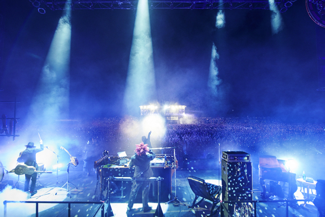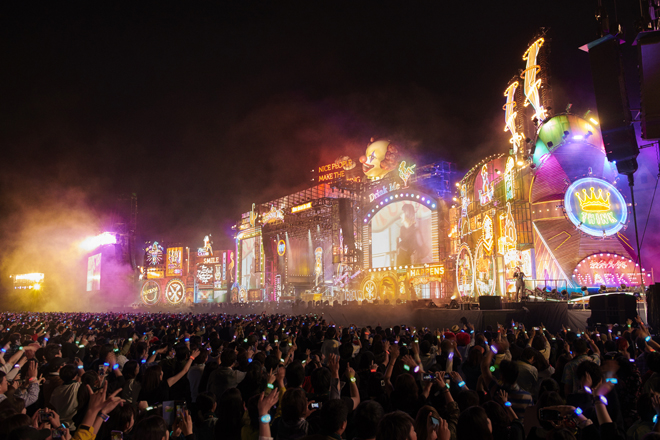 また、今回のライブで最も言葉で形容しがたい光景のひとつが「スターゲイザー」で、ヴィジョンに映し出された歌詞と客席に向けられた圧倒的な閃光による体験がまだ体に残っている。日が暮れてから一気に発光したステージセットの光景自体も物凄かった。その成果でもあるのだろう、ライブ会場をあとにしてから時間が経った今もなお、彼らのステージとメッセージは日常まで続いている。