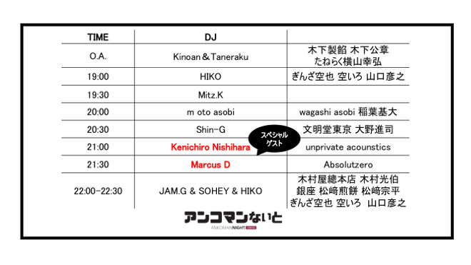 今回は、アンコマン若旦那衆がDJとして登場するほか、シアトル出身のDJ・Marcus D、ファッションを中心に幅広い分野の音楽で選曲・作曲・プロデュースを手掛けるDJ、プロデューサーのKenichiro Nishiharaがスペシャルゲストとして出演する。
