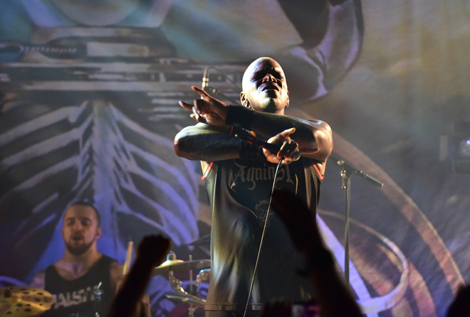 ヴォーカリスト:デリック・グリーンもまた、圧倒的なまでの存在感を見せつける。褐色の巨神像とでも呼ぶべきステージのプレゼンスはもちろん、その咆哮もまた、セパルトゥラの音楽性に新たなディメンションをもたらすものだ。彼はまた「カイロス」などでパーカッションを担当、観衆の獣性を駆り立てることにも大いに貢献した。