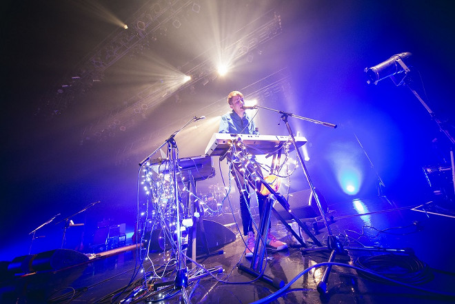 目前に壮大な風景が広がる「Something」、弾き語り調から次第にダイナミックになった「SPACE 666」など、エモーショナルなヴォーカルを煌びやかなサウンドに乗せていく。サウンドのレイヤーが分厚くなるにつれて、1曲の中でのドラマ性もどんどん膨らんでいった。いったんバックトラックが完成してからは、ステージ中央でヴォーカルだけに集中したり、オーディエンスを煽ったりも。一人きりのライヴとはいえ、臨場感が圧倒的だった。