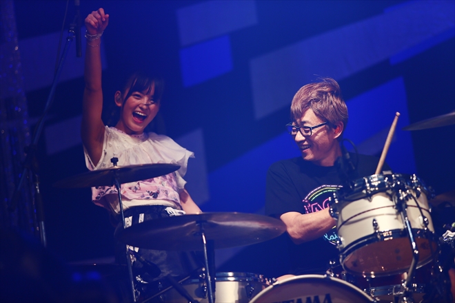 ホール会場ならではの音の迫力で見る者を圧倒したのが、その後の「どっとjpジャパーン!」。重低音がいつも以上に響き、アイドルコンサートとは思えないパンチあるサウンドが轟く。兵庫県の地名が登場するユニーク歌詞と、レトロなテクノポップが交わる「尼崎テクノ」もボーカルのエコーがしっかり効き、ホール会場だからこその声の伸びを堪能できた。「Pa Pa Pa Party」のあと、この日最初のMCでは堀が「CMJKさんがいなければ、このCLUB RAINBOWは成り立ちませんでした」とツアーの立役者を称えた。CMJKは一旦ここで降壇し、6曲目「レインボーロード〜駆け出した靴〜」から、たこ虹バンドが登場。