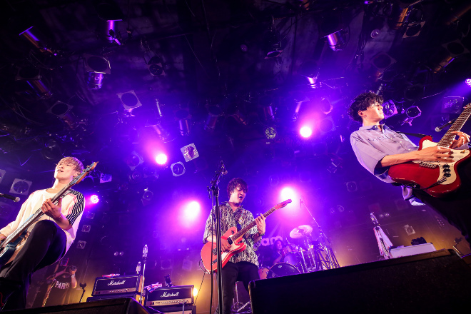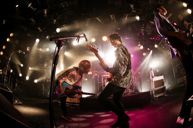 猛烈な疾走感と、強力なダンスビート。「TONIGHT」から「サテライト」へ、慣らし運転もなくバンドはいきなりトップギアだ。「透明シミュレーション」から『Bulbous Bow』のトップを飾る「Bandwagon」へ、スピードチューンを連ねて突っ走る。ギターの須田原生とベースの辻怜児は、守備を知らないFWのように最前線に走り出たまま戻らない。「Bandwagon」ではドラムの鈴木敬による強烈なマシンガンビートと、目もくらむストロボがシンクロする。ボーカル小関竜矢は扇の要に立ち、伸び伸びとハイトーンを響かせる。バンドがこのツアーでどれだけ自信を得たか、たった4曲で答えは出たようだ。