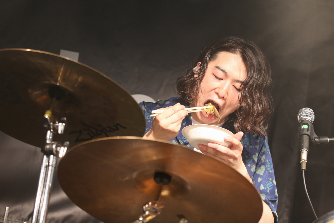 ここでライブはちょうど折り返し地点を回った。小関がギターを豪快にかき鳴らして“一緒に歌おう!”と煽る「僕から君へ」、須田がミニキーボードを持ち出して可愛らしいフレーズを奏でる「memento」、明るく広がるラテン調ダンスチューン「HEY!!」と景気のいい曲を続けたあと、突如演奏をストップして一体何が始まるかと思ったら、鈴木の“もぐもぐタイム”というツアーの恒例行事だそうで、この日選ばれた東京ならではのメニューはなんと“どぜう鍋”。演奏中のエネルギー補給という目的を逸脱し、そのまま飲み会へ突入しそうな展開をほんの一口にとどめ、何事もなかったかのように演奏に戻る鈴木がなぜかかっこよく見える。Bentham以外の誰にもできない、いや誰もやらない展開に拍手と歓声が降り注ぎ、フロアに笑顔の花が咲いた。