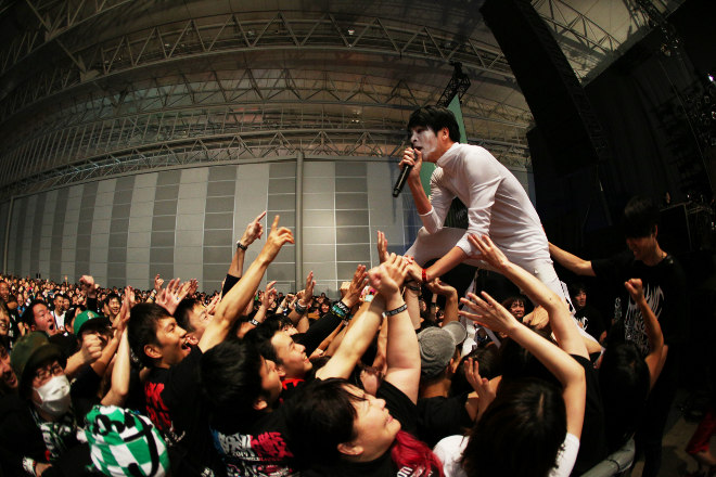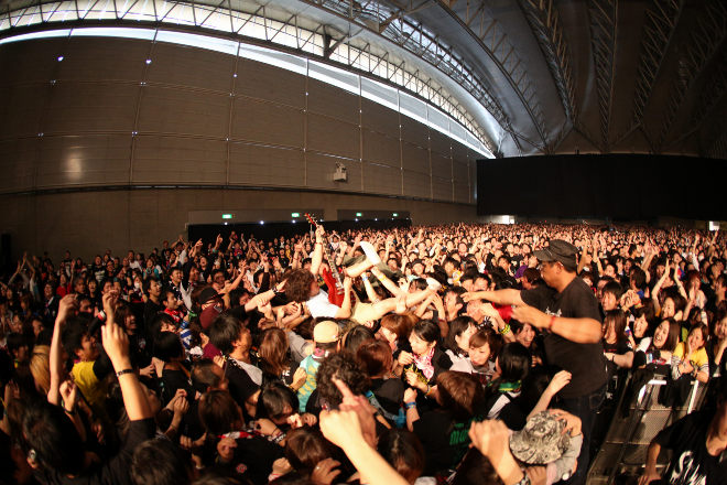 「SATANIC CARNIVALにコミック・バンドがやってまいりました。存在が浮いているなら、もっと浮いて、浮いて、ジャンプ!」と煽ったと思えば、今度は「HEY-SMITHがトリと聞いて練習してきました」とトランペットを手にした北島。吹いてみたものの、音は全く鳴らず、予想通りの展開に大歓声。また「クラーク博士と僕」では、まさやんがギターケースを持って客席エリアに突入。ファンが持ち上げるケースの上へサーフィンするがごとく乗っかり、ギターを弾きまくる。「鋼鉄の段ボーラーまさゆき」で、まさやんが背中から装着する名前入りパネルは、<SATANIC CARNIVAL>だけに、PIZZA OF DEATHの溶けたフォントの本日限定もの。さらに「Mr.Cosmo」では、北島が客席エリアに突入し、ファンも巻き込んでPAエリアを中心にした巨大サークルまで作る。