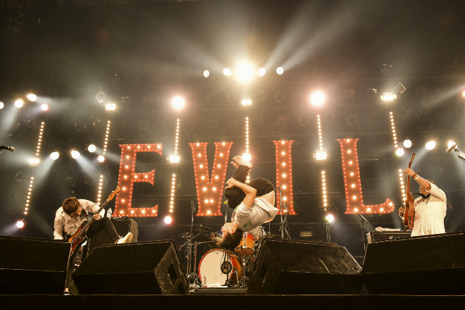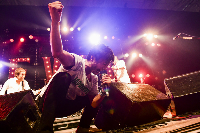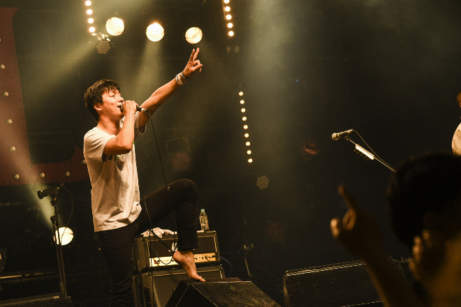 後半に差し掛かり、「僕らの(メジャー)デビュー曲、ジジイになっても歌う」と城戸が熱く語ると、「哀愁交差点」をプレイ。冒頭にハーモニカを導入し、凛としたまっすぐな歌声を幕張メッセに堂々と響かせる。すると、肩車に乗って大騒ぎする観客たちも見かけ、この曲がいかに多くの人に愛されているかを証明するようなワンシーンだった。ラストは「贈りもの」、「物憂げ世情」と続き、後者ではイントロから観客がシンガロングする有様で、バンドもその熱気を追い風にパワフルな演奏で駆け抜けていった。最後は城戸が鮮やかなバク宙を決め、ラスト1秒まで沸かせてくれた。
