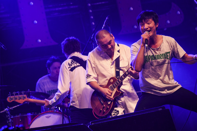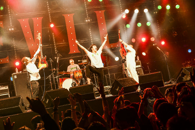 2015年の再結成以来、3年連続でEVIL STAGEに出場したのは愛媛発の4人組・ジャパハリネットだ。開口一番、「すげー!」と城戸けんじろ(Vo)がここに集まった人の多さに驚きつつ、オープニングは「若葉咲く頃」で火蓋を切ると、早くも拳を突き上げて騒ぐ人たちの姿が確認できた。続いてアップテンポな「蹴り上げた坂道」に入ると、会場はより一層活気付くばかり。