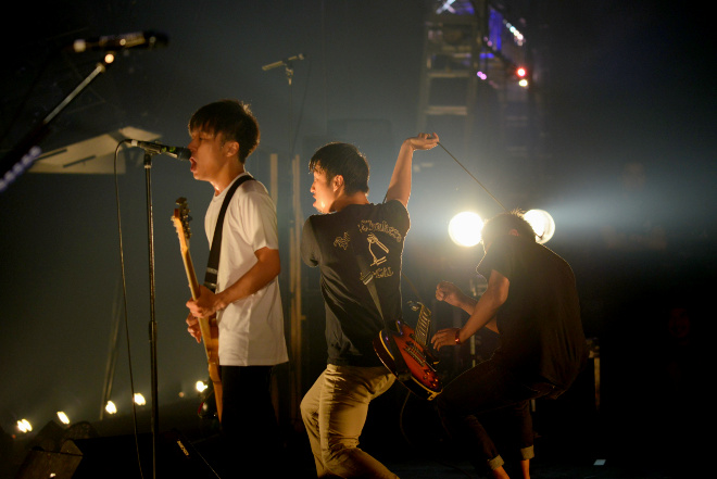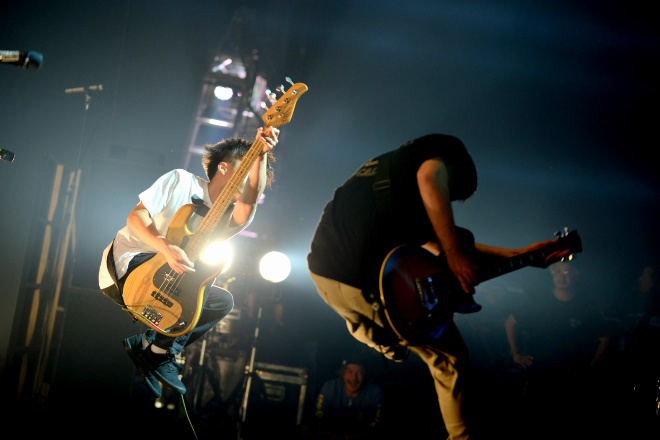「ナガサキローカルヤンキー、SHANK始めます!」という、庵原将兵(Vo,B)による明らかにG-FREAK FACTORYの茂木洋晃を意識した一言から「Surface」を歌いあげ、ぐっと観客の気持ちをひきつけてから、メロディック・パンクの「Cigar Store」につなげ、演奏が一気にテンポを上げると、池本雄季(Dr,Cho)がエネルギッシュに鳴らす2ビ-トに煽られるように観客がダイヴを始め、“Oh oh”というサビのコーラスに応えるように拳を振りあげた。