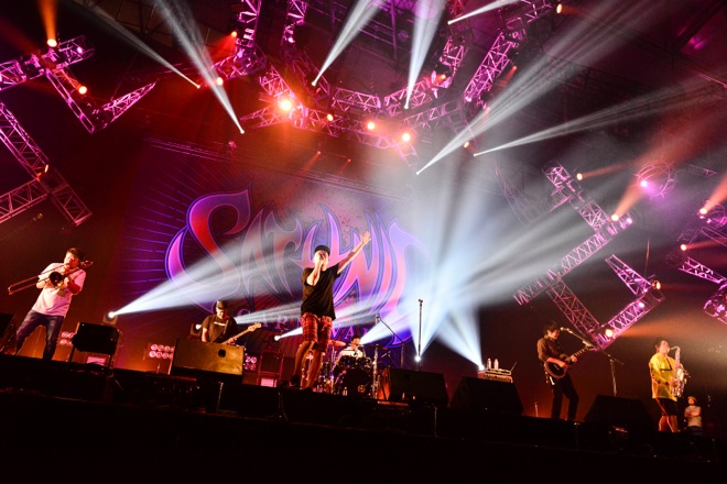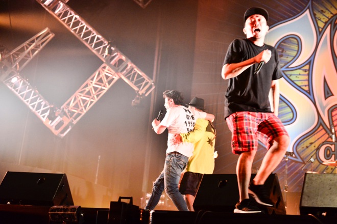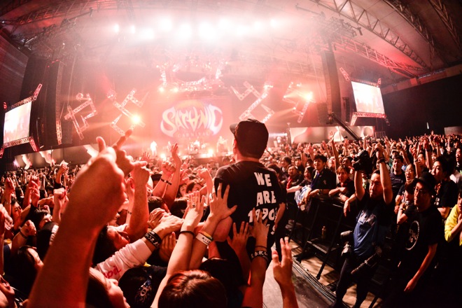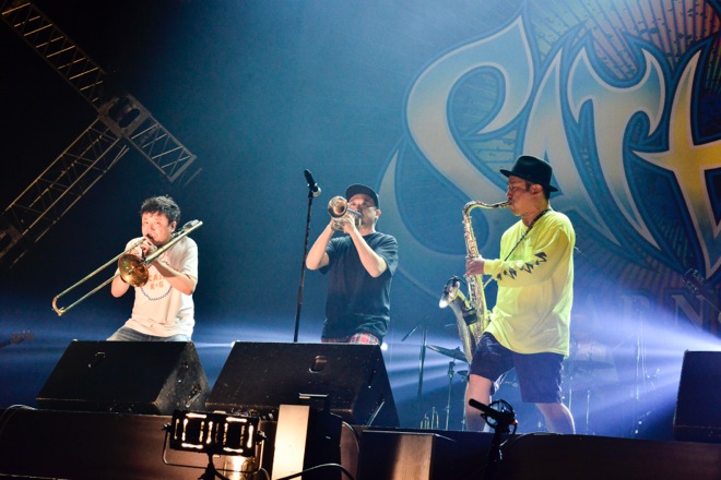 毎年、必ず1つはあるベテラン枠は、もはや<SATANIC CARNIVAL>の裏ハイライト、もう1つの見どころだ。SCAFULL KINGのメンバーたちもそれを理解しているのか、SYUTA-LOW“TGMX”TAGAMI(ヴォーカル、トランペット)、AKIRATT KURIMOTO(トロンボーン、コーラス)、NARI(サックス、コーラス)ら、ホーン隊の3人がステージをエネルギッシュに動き回り、飛び跳ねながら、スカコア、スカパンク、ホーンが鳴るロック・ナンバーの数々を演奏しながら、曲間のMCでは、「ラウド・シーンの最前線で活躍しているバンドが集まっている中、俺たち、全然、最前線じゃないけど、1つ言えるのは最年長です。どんどん俺たちが弱っていく姿をみてもらってもいいかな?(笑)」(TGMX)と自虐ネタを織り交ぜ、笑いを誘い、観客の気持ちをなごませる。