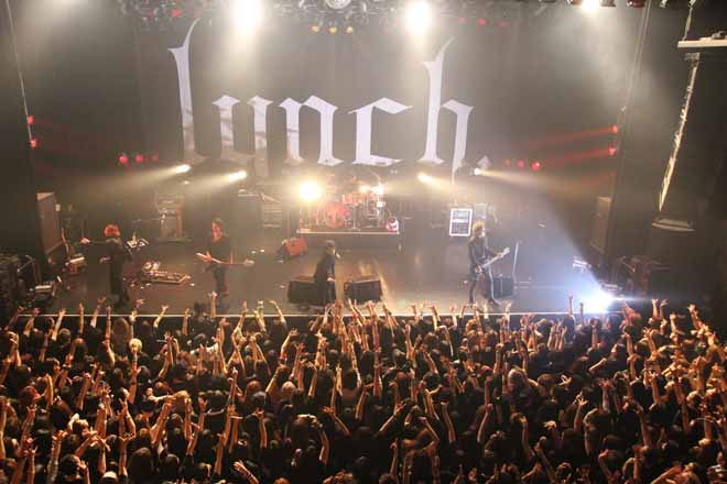 先攻はlynch.。挑まれた側であるにも関わらず、余裕すら感じさせる貫禄をたたえながら登場するメンバーと共に「lynch.」と掲げられた巨大なドロップがゆっくりとステージにせり上がる中、葉月(Vo)の「聞かせてくれ!」という声で「EVOKE」からライヴはスタート。伸びやかな葉月の歌声と、貫禄たっぷりの楽器陣のヘヴィ・サウンドがO-EASTにたちまち大きなうねりを生み出す。