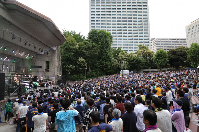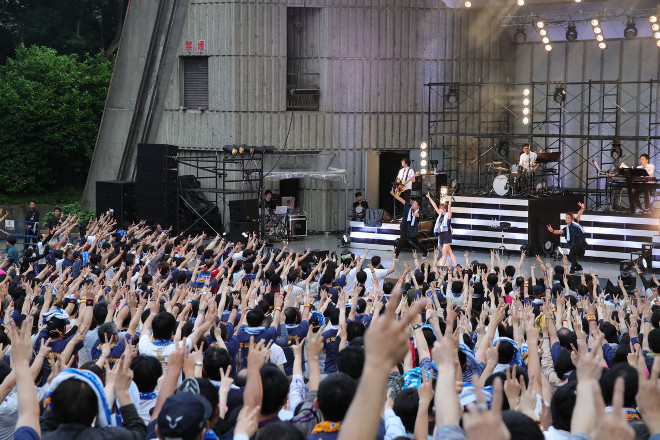 一旦ステージを降壇し、白の衣装にチェンジして再び登場すると、ライブは後半に突入。ポルノグラフィティ新藤晴一の作詞によるラテンフレイバーの「モンスター」、黒いエレキギターを自ら弾いての「Brain Diver」、大定番の「射手座☆午後九時Don’t be late」と1曲ごとにテンションを高めていき、観客のコーラスが響き渡る「AMICITIA」で最高潮に。ちょうどそのタイミングで日没時間となり、夕闇が濃くなっていく中、会場が一体となった。