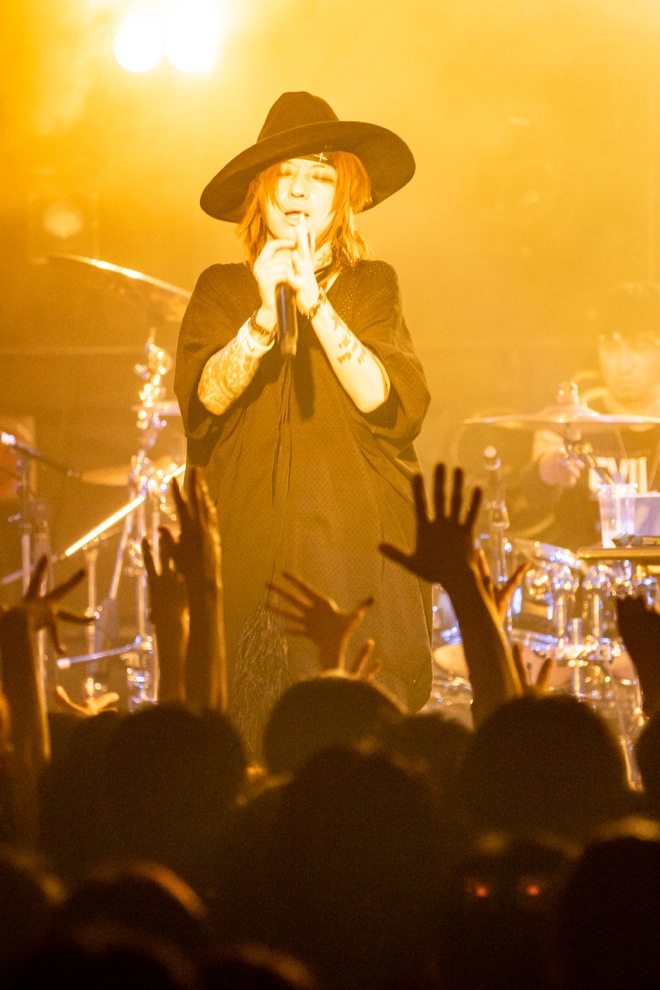 その後も冗談交じりのMCを加えながら、とにかく凶暴でグラマラスなサウンドを響かせるsads。ゆるりとした空気から一気に引き締めるその切り替えは、そうそう観られることではなく、まさに神業的ともいえるだろう。清春がステージを所狭しと動き回り、大きな声を上げれば、それ以上のパワーをオーディエンスも返そうとする。どこを切り取ってもクライマックスのような場面ばかりが続いていく中で、特に印象的だったのがスケール感みなぎるロックチューンな「spin」。屈強なサウンドの中で力強さとしなやかさを持ち合わせた歌を鳴らしながら、観る者すべてへ襲いかかる。その技術もさることながら、切れ間なく攻めの姿勢で踏み込み続けるのが驚異的なのだ。