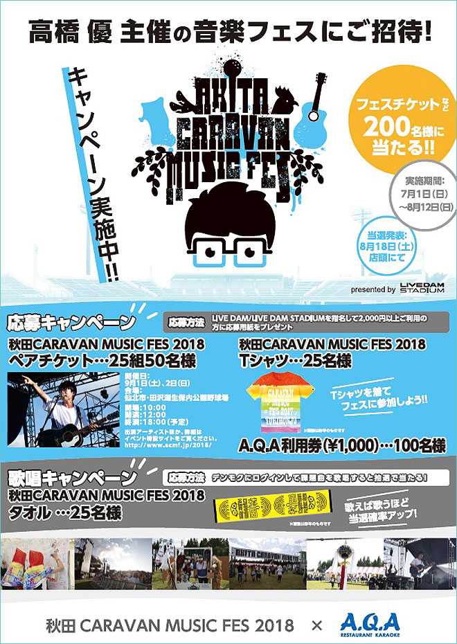 フェスに先駆け、秋田県内で展開するカラオケA.Q.Aが、<秋田CARAVAN MUSIC FES 2018>とのコラボキャンペーンを実施。LIVE DAM/LIVE DAM STADIUMの利用でチケットやTシャツを抽選でプレゼントする応募キャンペーン、課題曲を歌って当たる歌唱キャンペーンの2本立てで、フェスを盛り上げる。