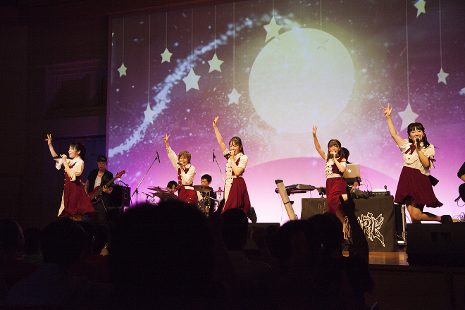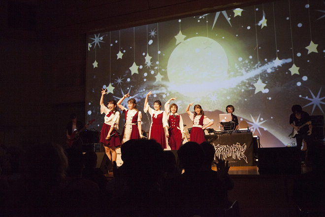 現体制になって4周年を迎えた今回の公演では、今までSTARMARIEが自身の世界観をより表現するために実施してきたバンドスタイルと映像演出を融合させることが事前に告知されていた。会場に大きな期待感が渦巻くなか、暗転とともにバンドメンバーの4人がステージへ登場。「君がした選択は正しかったかい?今でもそう言えるかい?」と、語りかけるようなナレーションがこの日のステージの始まりを告げる。STARMARIEのメンバー5人が星となり、それぞれが世界中から集まってくるOP映像とともにメンバーがゆったりとステージへ登場。この日お披露目となる新衣装を身に纏い、悠然と歩むメンバーには大きな歓声が贈られ、「Hey,My sister」からスタート。軽快なロックサウンドのグルーヴ感と、一面に広がる星空の映像の中、全24公演の今ツアーの中でさらに磨き上げられた5人のパフォーマンスが小宇宙へとトリップさせてくれる。続いてちょっぴりダークなバレンタインソング「ブラックバレンタイン」で裏にどこか怪しさを漂わせながら可愛く会場をハートに染め上げた。この日、マニュピレーターで参加した須賀勇介が積極的にフロアを煽り盛り上げていく。