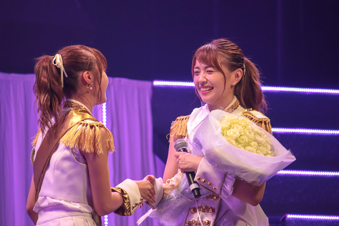 その後、メンバー1人1人から卒業する彼女へメッセージが送られ、リーダーの溝手るかは「8年間本当にお疲れさまでした。たそ(志村理佳)は“8年間もSUPER☆GiRLSにいさせてくれてありがとう”って言うけど、8年間たそがSUPER☆GiRLSを支えてくれたから、私も今ここにいるし、今のSUPER☆GiRLSがあると思います。私がリーダーになった時、たくさん支えてくれてありがとう。たそがいなくてもるかちゃん大丈夫だなって思ってもらえるように、これからも頑張ります。たそも新しい道で頑張ってね!応援してます。今までありがとう」と、一緒に歩んできた日々を振り返り大粒の涙を流した。