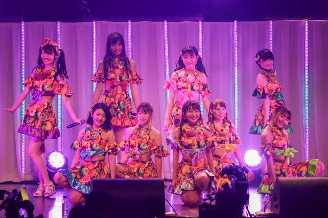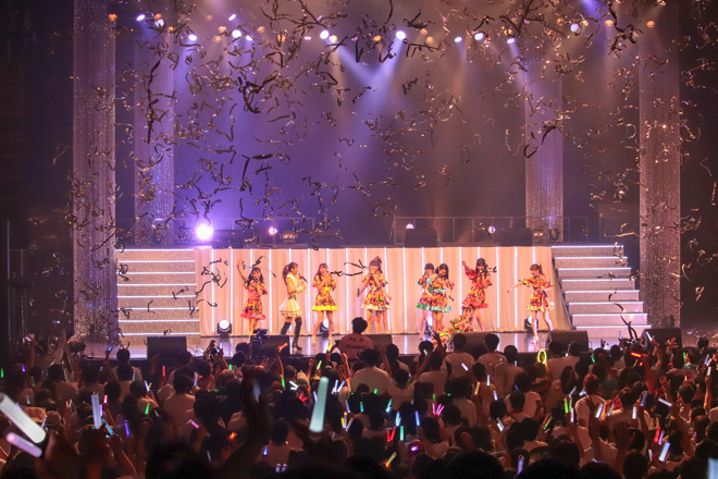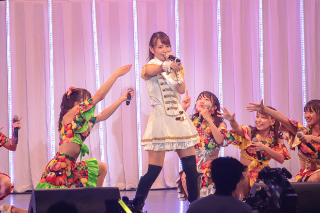 夜公演のライブはオープニング曲「花道!!ア〜ンビシャス」の冒頭、この日の公演をもって卒業するメンバーの志村理佳からの宣誓でスタート。その後、「プリプリ♥SUMMERキッス」「キラキラ☆Sunshine」とヒットナンバーを披露し、序盤からファンのボルテージは最高潮へ達した。