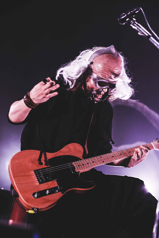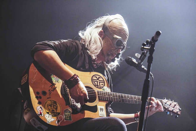 ステージには“三途川”と書かれた橋。冒頭、その橋の上に登場した島爺が、アコースティックギターをかき鳴らす。徐々にボルテージを上げていくその曲は、ツアーをイメージして作られた「はじめに」だ。その勢いのまま「ムーンウォークフィーバー」、「ブリキノダンス」と、日向電工作の人気曲を披露し、フロアは一気に沸点を超えた。