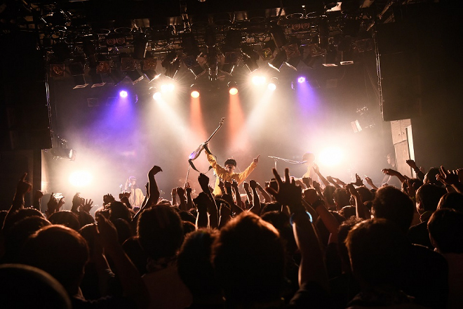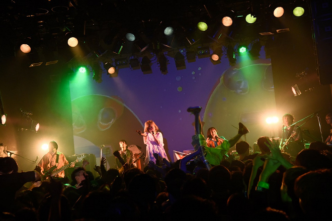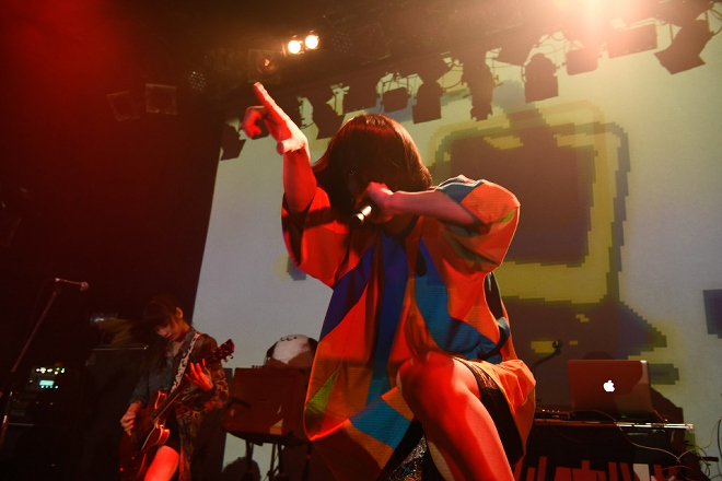 前回のソールドアウトから、念願のルーツ&リスペクトするバンド2組を招く形で行われた今回の2DAYS。1日目にはPOLYSICSがゲストバンドとして登場した。実は魔法少女になり隊結成前に、火寺バジル(Vo)とgari(VJ/Vo)がPOLYSICSのコピーバンドを組んでいたという。コンピューター音楽を搭載した独創的な音楽性は、魔法少女になり隊にとってルーツとなる存在で、まさにメンバー念願の対バンが実現した一夜となった。