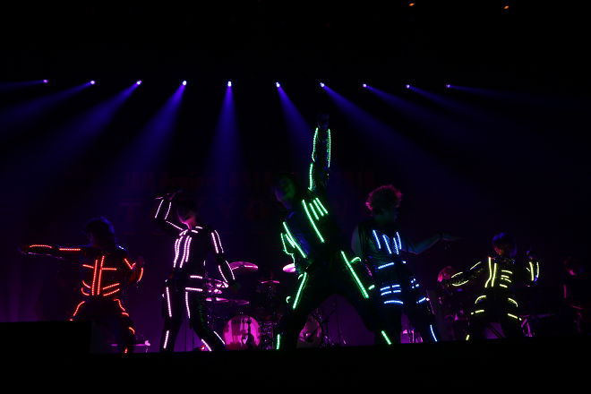 最終日となったソウル公演は、これまでのツアーと同じく、イントロダクション「Spinning Out of Control」が鳴り響く中、バンドメンバー、そしてJAM Projectが登場し、客席からは大歓声があがり、ペンライトによる一面の赤い光の波で埋めつくされた。JAM Projectメンバー全員がステージに揃うと、早速、アルバムリード曲「TOKYO DIVE」に突入。これまでの今ツアーでも披露されてきた、LEDで装飾された電飾衣装が点灯すると、オーディエンスは、すでにテンションは急上昇。そして、畳みかけるように、アルバム『TOKYO DIVE』からの新曲たちを次々と披露した。