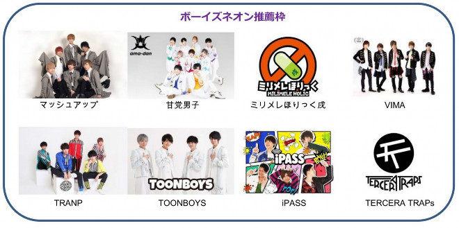 今回発表されたのは、M!LK、さくらしめじ、CUBERS、BB-voice、TRUMP、越中睦士(Λucifer) 、SUPER FANTASY、FIZZY POP(ナチュラル炭酸)、BUZZ-ER.、White Explosion、EverZOne、CrownClown、FEARLESS、MAUVE、CoLoN:、AsteRisM⁂、Backslash//、アシスタントボーイズ(仮)、さくらんBOYZ、東京力車、そして“ボーイズネオン推薦枠”として出演するマッシュアップ、甘党男子、ミリメレほりっく戌、VIMA、TRANP、TOONBOYS、iPASS、TERCERA TRAPsの計28組だ。