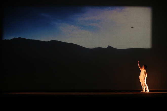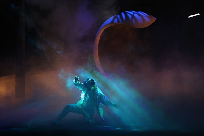 再び場面が変わって、今度は大きな飛行船が空をゆっくりと飛んでいく映像が現れる。「飛行船」で、本当は“ただ自分でいたいだけ”、だから “いま走り出す”と歌い放つと同時に、舞台後方からライトが眩い光を放ち、三浦が突如激しく踊り出した場面は圧巻だった。舞台を左右いっぱいに使って、身体のなかに漲き上がってきたエネルギー、その生命力が再び自分を突き動かしていくその瞬間をエモーショナルに表現していったこの場面は、とてつもなくヒューマンで、この舞台を通して主人公がいつもの三浦大知にもっとも近づいた場面だったように感じた。