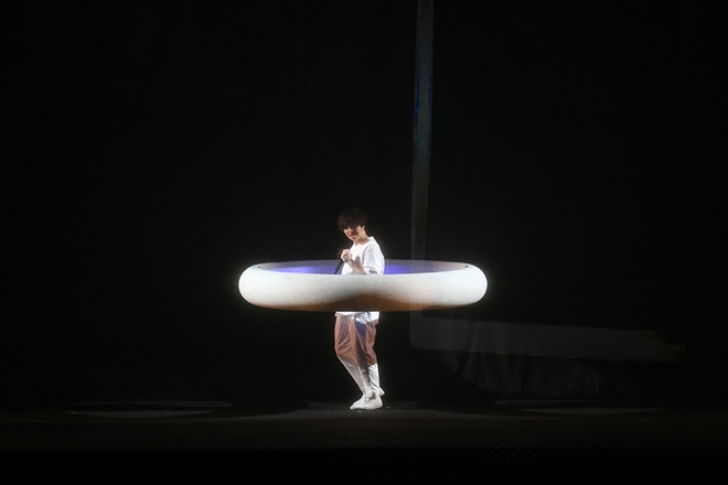 場面は変わって、スクリーンには飛行船が飛んでいる青空が映し出される。それが砂浜へと変わっていった「クレーター」では、手についた砂を払ったり、つまづいたり、波をさけるようなダンスで君との思い出を“笑顔”で回想しながら砂浜をさまよい歩いていると、再び冒頭の部屋へ到着する。「独白」はこれまでのシーンをリプレイするように、ドーナツ型のライトなどが再登場していった。そうして始まった「世界」では、“君こそがこの世界のすべて”と歌ったとこから、これまで冒頭から真っ暗だった客席が、じょじょに照明で明るく照らされていって、隣に君がいて僕がいて、支え合って愛し合って、それが未来へとつながっていくと『球体』のフィナーレを圧倒的な歌で描いていったシーンは圧巻だった。