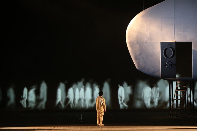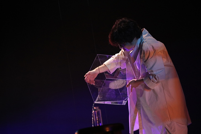 アクリルの水槽に入っていた水を半円型のものに入れ替え、それがゆっくりと宙に浮かぶと、舞台が深い海の中になり(これがとても美しかった)、床に座り込んだ三浦が歌の頭から泣きのファルセットを使って「淡水魚」を歌い出すと、行き場を失ったせつない気持ちが場内いっぱいに広がって涙が出そうになる。双眼鏡を構え、息を押し殺して舞台を凝視していた観客たちは、物語の前半だけでこの作品の奥深くへと引き込まれていった。