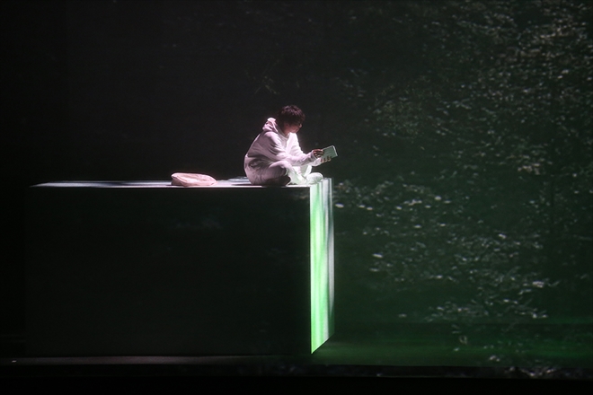 客電が落ちると、舞台の下手に簡素な部屋が現れる。観客たちは、まるで演劇でも見るように、固唾を飲んでステージをじっと凝視。薄暗い部屋のなかに、白いパーカーとズボンを着て眼鏡をかけた男がひとり佇んでいる。部屋の奥には白い服をかけたハンガーラック。曇りガラスの向こう側、ガラスのベッドの上に立った男が「序詞」を歌い出す。行きたい場所が見つからなくて“教えて、ああ”と歌う三浦のヘッドボイスが、セリフのように胸に突き刺さる。