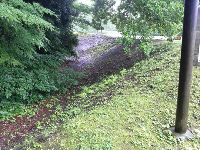 このコラムを執筆する為4度目の城の見学の日、朝から土砂降りの雨が降っていた。当然ながら城には誰もいない。これは深大寺城を独り占めだなと思いきや、植物公園の道をチャリで滑って転びそうになっているおじさんがいた。警備員なのか単なる近所の親父なのかわからなかったが、このおじさんはチャリで転びそうになるとすぐさまチャリをほっぽり、自分だけ「お~とっと~!」と言って歌舞伎の五右衛門みたいなアクションをとって、またチャリを起こすということをやっていた。最初に私と通り過ぎた時も、