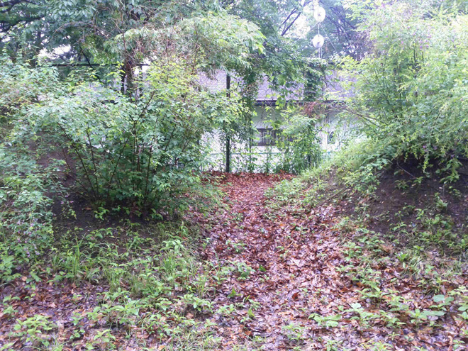二の丸から見た本丸の土塁、そして空堀も圧巻である。木の枝が伸び過ぎてクネクネと折れ曲がるデザインになった土塁や空堀の魅力が若干半減してるのが悔しい。この空堀を左に見て二の丸の奥まで行くと、土塁が切れている部分がある。ここが二の丸から先にあるもう一つの腰曲輪へ行く動線だ。現在はここから先が金網になっており、80年代の青春映画のような俺たちはあの夏、あの金網を超えることが出来なかった的な金網になっており、その金網の先は民家が立っている。腰曲輪だった場所の土地を買い、腰曲輪だった場所に家を建てて住む、その気持ちを住民にインタビューしたかったがピンポンダッシュくらいにしてやめておこうと決める。いやいやそんなことはしないが城マニアとして城内に土地を持つって羨ましいのだ。