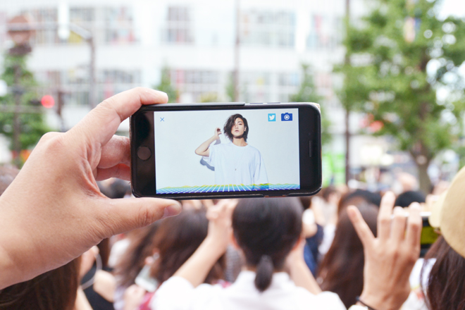 スペシャル上映会では、連動スマホアプリ「Another Track」をあらかじめDLして視聴の準備をしておき、上映中にアプリを起動したスマホをかざすことで、ユニカビジョンと同期した高音質サウンドをスマートフォンから聴くことができる。新宿の中心で都会の喧騒から遮断され、ライヴ会場にいるかのような臨場感溢れるサウンドと大迫力の映像を楽しめるのがポイント。集まった人たちを見ると、イヤフォンやヘッドフォンを用意してスタンバイしている人もいれば、街の中に響くサウンドをそのままダイレクトに聴こうという人もおり、楽しみ方は人それぞれだ。