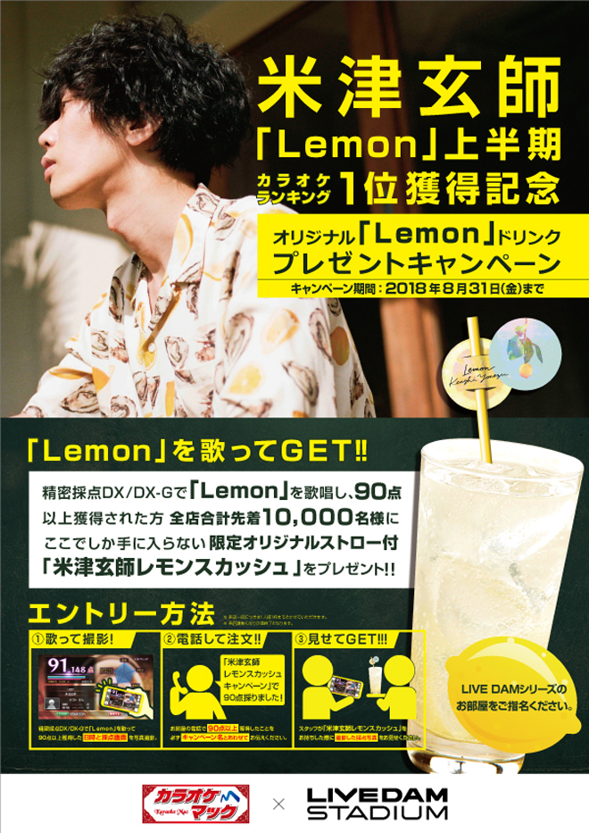 カラオケDAMの「精密採点DX」または「精密採点DX-G」で、米津玄師「Lemon」を歌唱。90点以上を獲得した人から全店合計先着10,000名に、限定オリジナルストロー付きの「米津玄師レモンスカッシュ」をプレゼントする。90点獲得の申告は採点結果を写真撮影のうえ、ルーム内の電話で伝えればOKだ(詳しくは下記参照)。