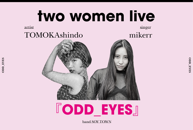 この度の<ODD _EYES>では3.5オクターブのシンガー”mikerr”がNEO Instrumental POPSバンド“SOYTOWN”を率いて再始動し、気鋭のフォトグラファーと言われながら踊ることをやめなかったアーティスト“新道トモカ”と“ツーウーマンライブ”を行う。