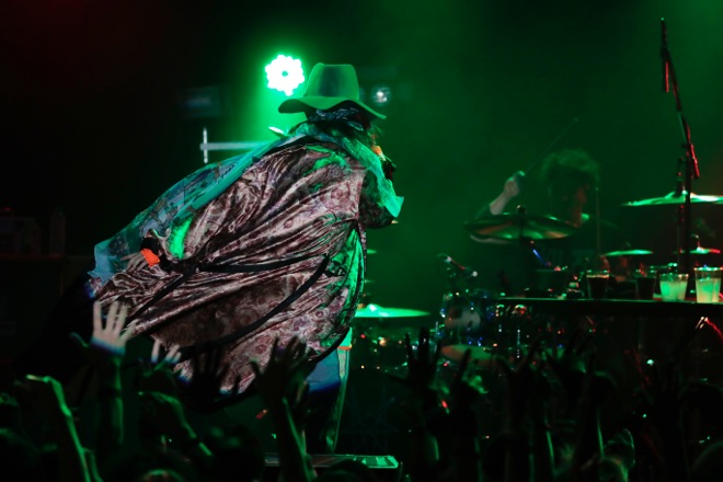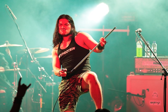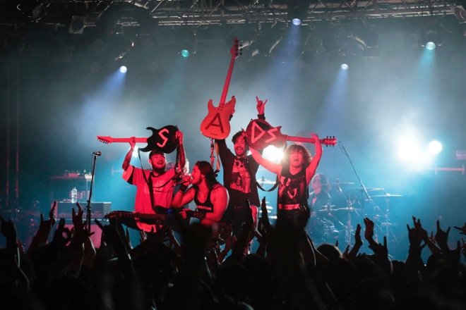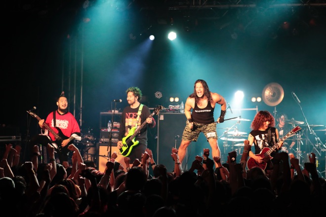 とIKEPYが豪快に自己紹介し、「Take! Me! Back! To Hell!」のコール&レスポンスが印象的な「KINGSLAVE」で、フロアに一気に一体感が生まれる。「でけージャンプを見せてくれ!」とのIKEPYの声を合図に観客が飛び跳ねる「KATANA」の絵面は、メタル・ダンス・フロアとでも呼ぶべき仕上がり。パワーのあり余った野獣たちが、時々コミカルな仕草を入れつつも質の高いパフォーマンスを見せるさまが痛快だ。