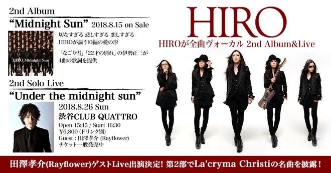 HIROは8月26日に、2ndソロライブ<Under the midnight sun>を渋谷クラブクアトロにて開催することも決定している。2部構成で行われるその第2部には田澤孝介(Rayflower)がゲスト参加し、La’cryma Christiの名曲の数々を披露することも発表となった。