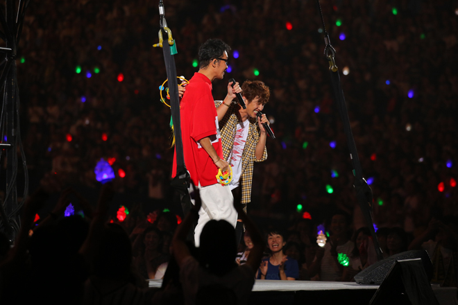 一昨日、大阪城ホールで公演があったというゆずは、この日のために大阪に残り、前日に映画鑑賞したことを明かしながらしばし和やかなトークタイムに。コブクロは路上ライブ時代の話にも言及し、1998年頃はゆずの曲を歌っている人が多く、“すだち”や“カボス”といった名前でやっていた路上ミュージシャンと戦っていたというエピソードも語られ、場内の笑いを誘っていた。また、ゆずも「デビューしてから、一回大阪で路上ライブやったよね」(北川)、「心斎橋だったかな?」(岩沢)といった思い出を話した。