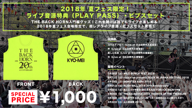 音源は、2017年の10月に東京・日比谷野外大音楽堂にて開催された<「KYO-MEIワンマンライブ」〜第三回夕焼け目撃者〜>から「コバルトブルー」、「声」、「美しい名前」、「刃」の4曲がプレイパスによってダウンロードもしくはストリーミングで聴くことができる。また、ビブスは蛍光グリーンのボディの前面に20周年ロゴ、背面にはTHE BACK HORNのシンボルマークである“KYO-MEI”のマークがプリントされたものとなっている。