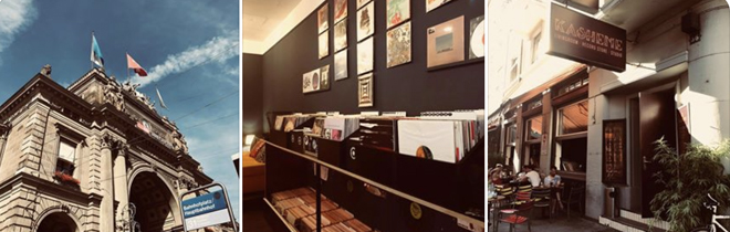 無事にスイス・チューリヒに到着。この日はチューリッヒのリヴィングルーム兼レコードストア兼スタジオ「Kasheme」のUstream番組とナイトクラブ「Zukunft」(日本語で“未来”、かっこいい!)にてプレイが待ってます。駅にKashemeのNickが迎えに来てくれて、ホテルに到着。少しくつろぎつつ、ギグのセッティングをして、Kashemeにゴー。前のスペシャルなべニューから移動した新しいKashemeは、レストラン&レコ屋のお洒落で可愛いべニューとなりました。
