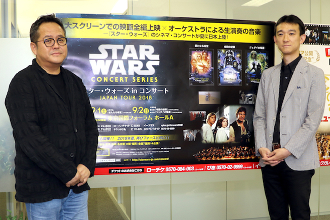 コンサートホールのステージに掲げられた巨大なスクリーンで上映される名作映画。そして、そのスクリーンの下では指揮者とオーケストラが劇中の音楽をリアルタイムで生演奏する。文章ではシンプルに説明することはできるが、その相乗効果が生み出す感動は、一度体験してみないとわからないという。これまで国内で開催してきた数々の<シネマ・コンサート>を企画・制作してきた株式会社プロマックスの飯島則充プロデューサーと、今回の<スター・ウォーズ in コンサート JAPAN TOUR 2018>にも出演する東京フィルハーモニー交響楽団 事業部・岩崎井織氏に話を訊いた。